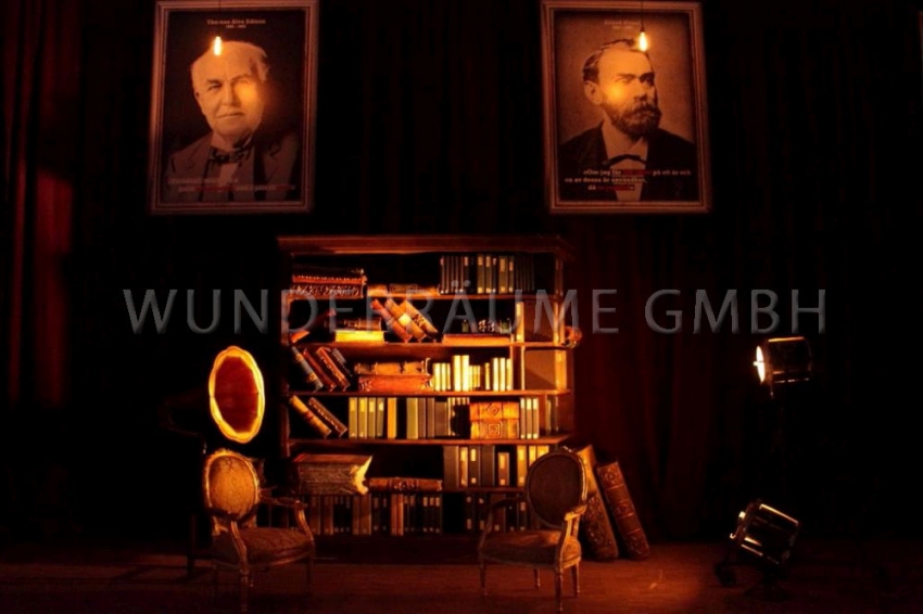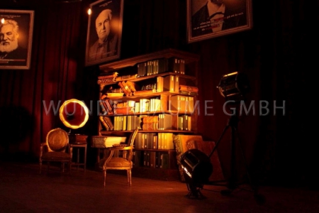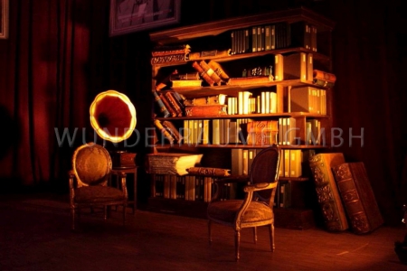 - 3,00 m x 3,00 m x 2,60 m (Länge x Breite x Höhe)- nostalgische Bühnenkulisse- mit detailreich verzierten Büchern- auf Wunsch mit goldenen Stühlen, nostalgischen Scheinwerfern und Grammophon- für indoor